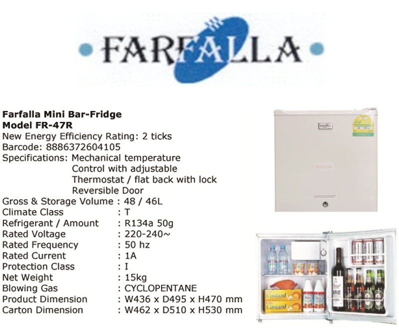 (Bulky) FARFALLA FR-47R 46L MINI BAR FRIDGE WITH LOCK, 2 TICKS, FREE DELIVERY|,|