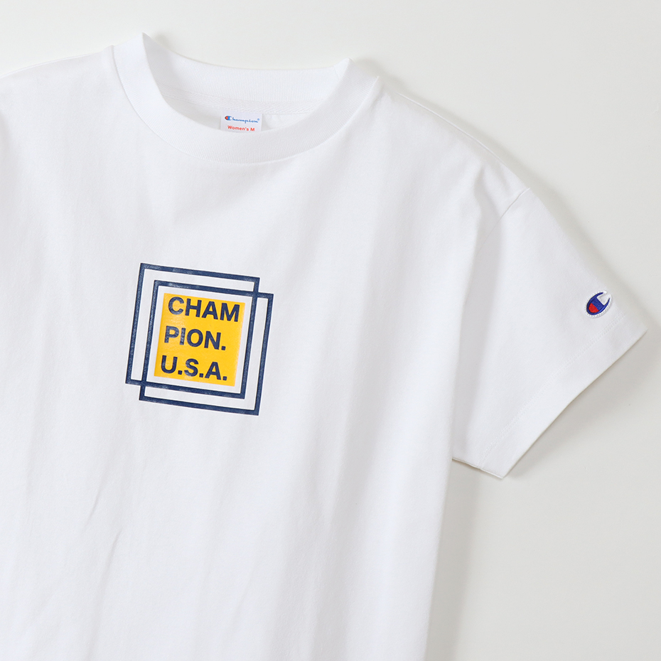 A dry and comfortable short-sleeve T-shirt made from 100% sustainable American cotton "Cotton USA" produced with consideration for the environment. Relaxed fit with plenty of body width and shoulder width. There are two types of graphics on the front that arrange the letters "CHAMPION" in a pop style. It is a particularly impressive design because of the good color development print. Due to the product washing process, it has a familiar texture from the beginning of wearing and is difficult to shrink after washing.
