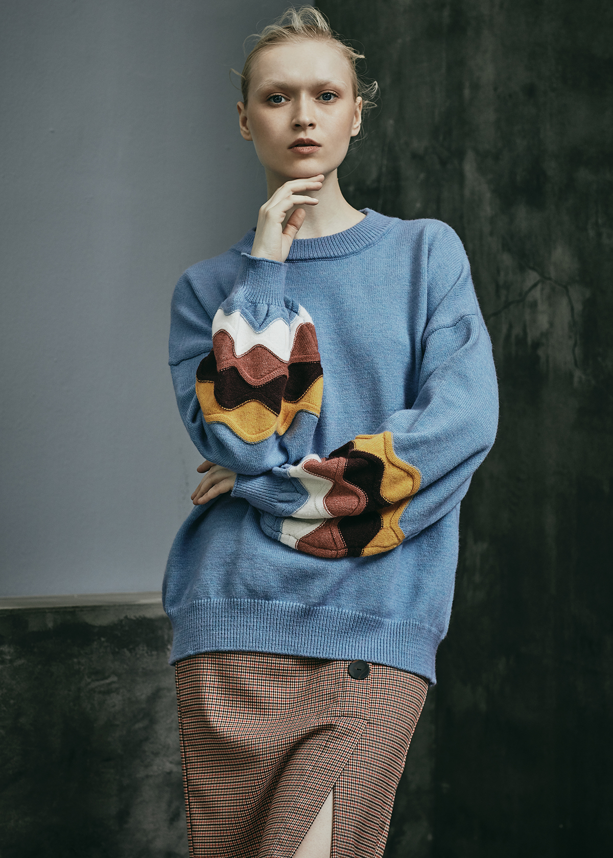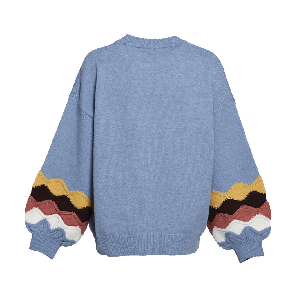 Crew Neck Oversized Knitted Sweater With Wavy Pattern Sleeves|,|