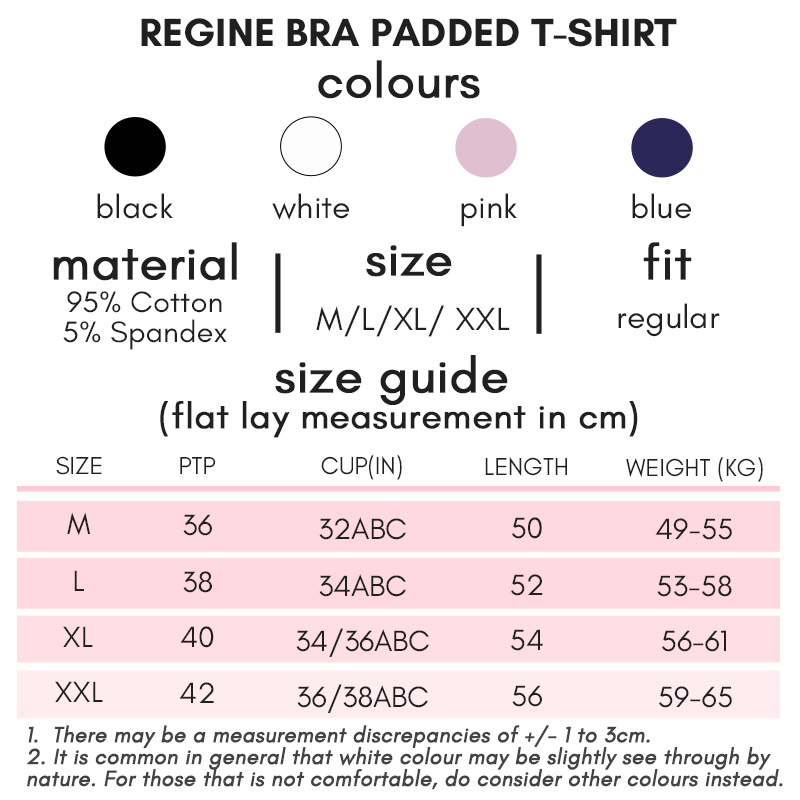Bra + Tee all in one top - Comfort with convenience. The inner padding is made of high-density top-grade form that retains its shape and volume after numerous use and washes. It is also suitable for machine wash. The inner layer is made of quality 40S combed cotton for added comfort and hygiene.