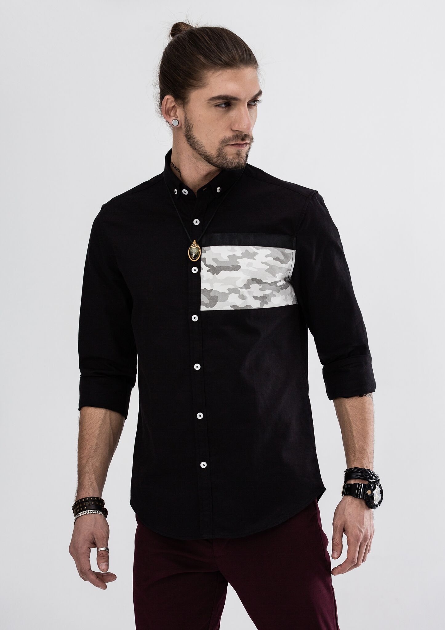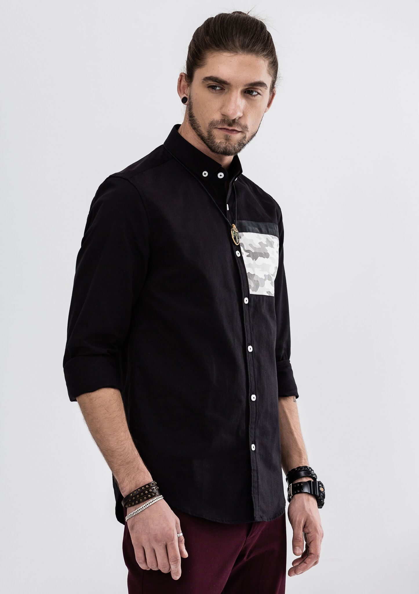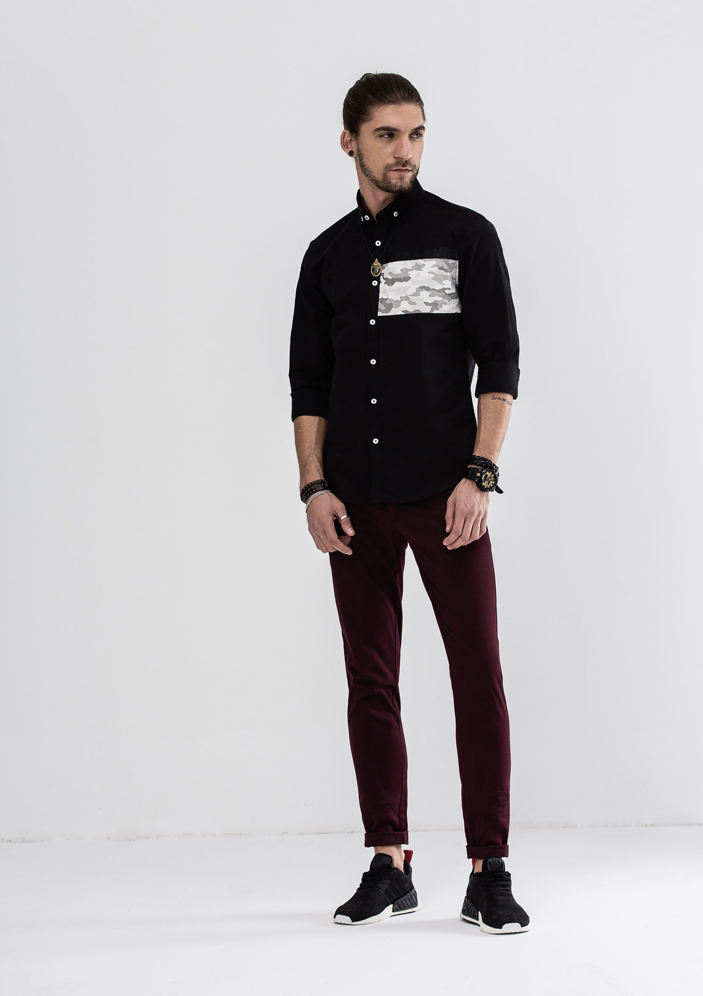- Simple block color with camouflage detailing for subtle sophistication.