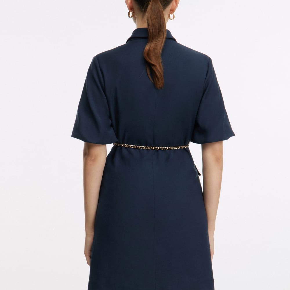 Blair Puff Sleeves Blazer Dress With Chain Belt in Regular Fit. Made with 71% Polyester 26% Rayon 3% Spandex.