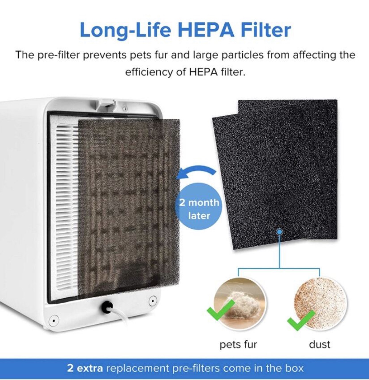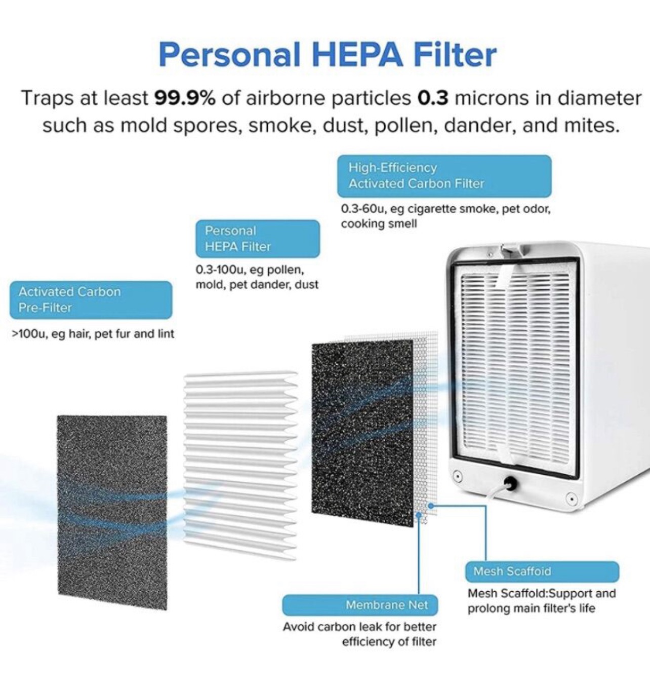 - 3 stage filtration system: pre-filter, true hepa filter, & activated carbon filter. It removes 99.97% of dust, pollen, smoke, odor, mold spores, and pet dander; filters particles as small as 0.3 microns and larger and filters air pollution of PM 2.5