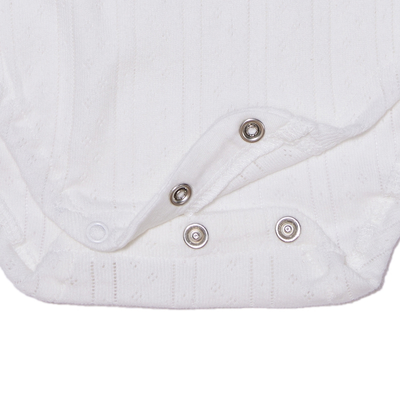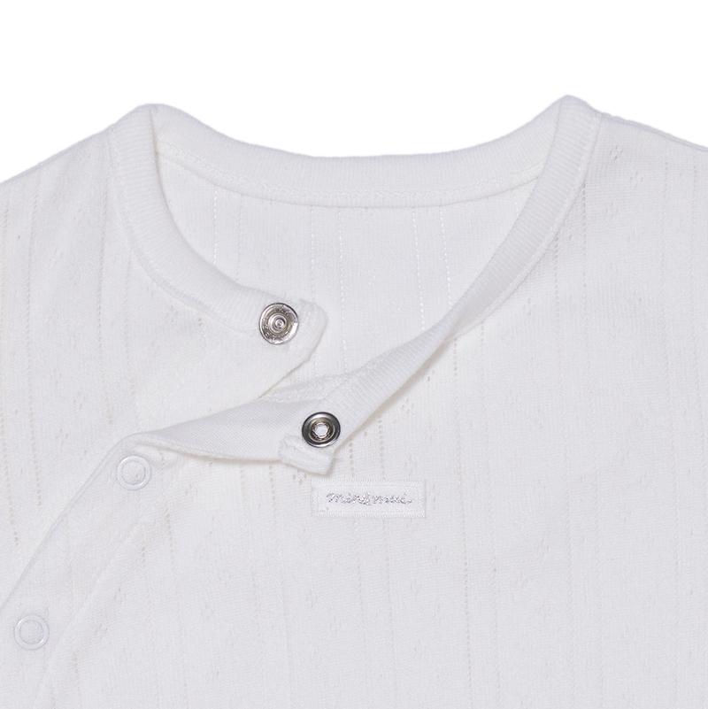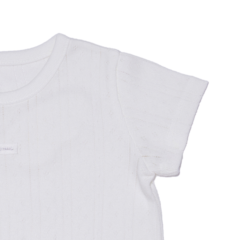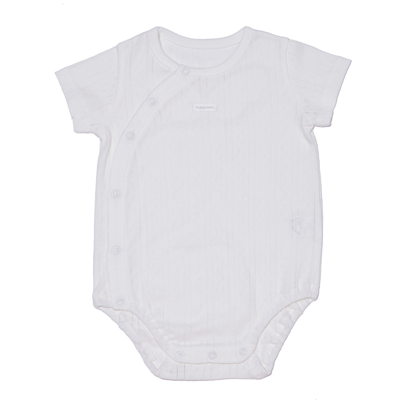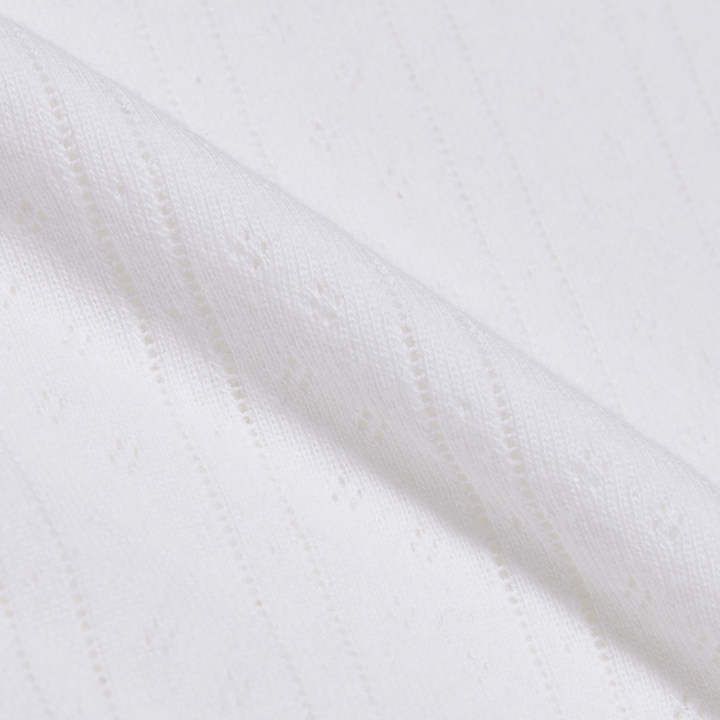 Crafted from circular knit eyelet that is stretchy and soft, and jacquard that is breathable, this garment is suitable for babies with sensitive skin. It features a versatile white color with an angel doll on the back, adding a touch of cuteness and making it a great gift for childbirth.