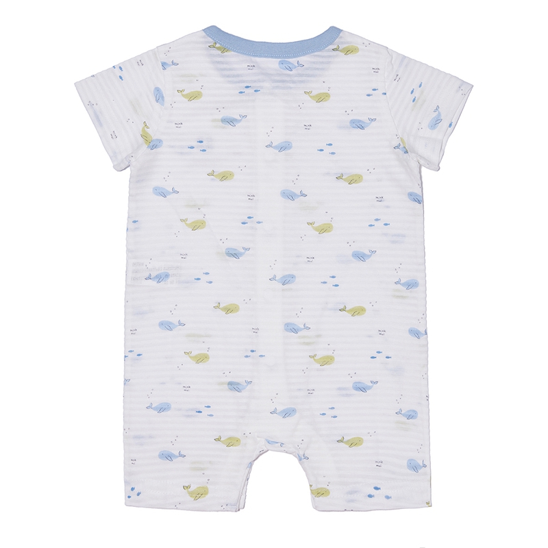 This half-sleeve baby bunting bodysuit is crafted from soft and lightweight jacquard fabric, featuring a cute whale pattern. The use of jacquard with a wide texture makes it breathable, ensuring a cool and comfortable feel for babies with sensitive skin.
