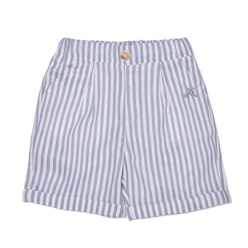 This striped pants feature a luxurious blue color. The elegant gold pearl fabric and embroidery adds a special touch, feeling soft against the skin.