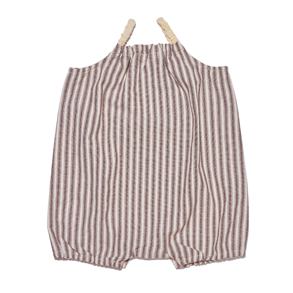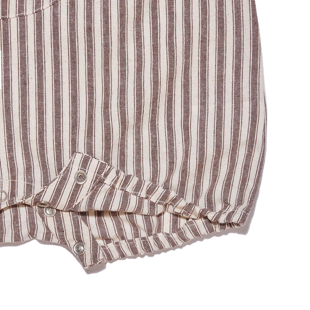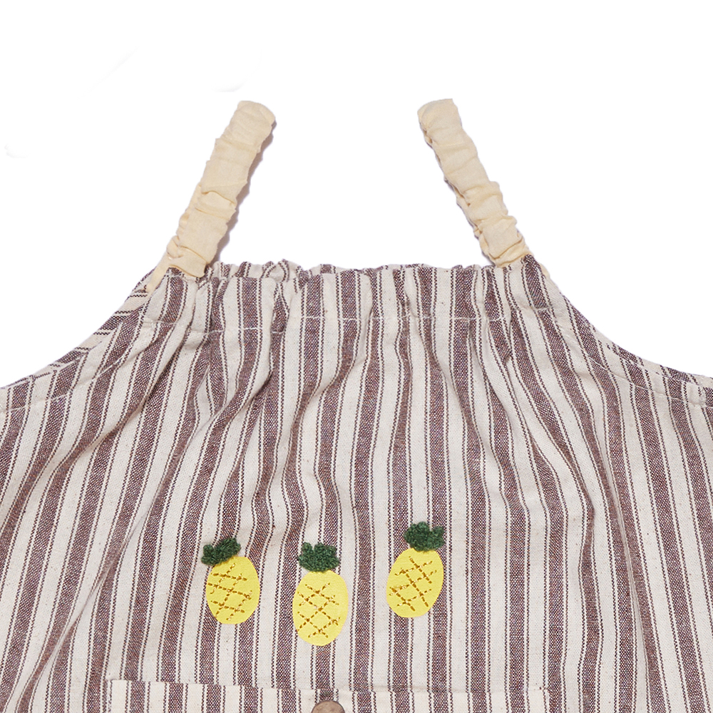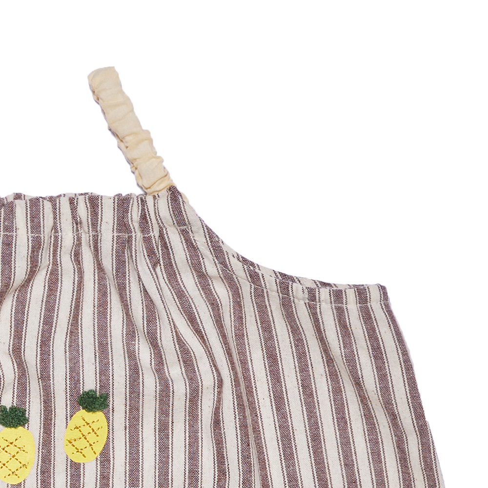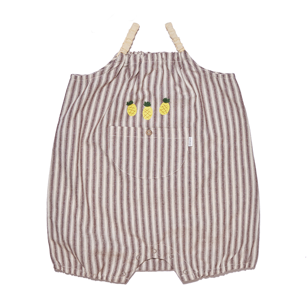 This sleeveless baby bunting bodysuit features natural brown stripes. The pineapple accents and the rabbit bonnet add an extra touch of cuteness. Made from woven fabric, it provides a cool and comfortable fit, perfect for summer.