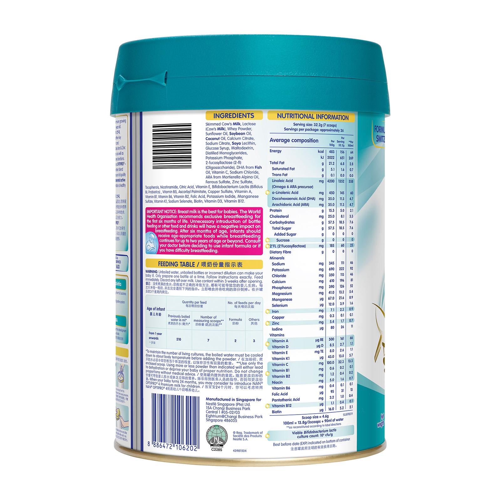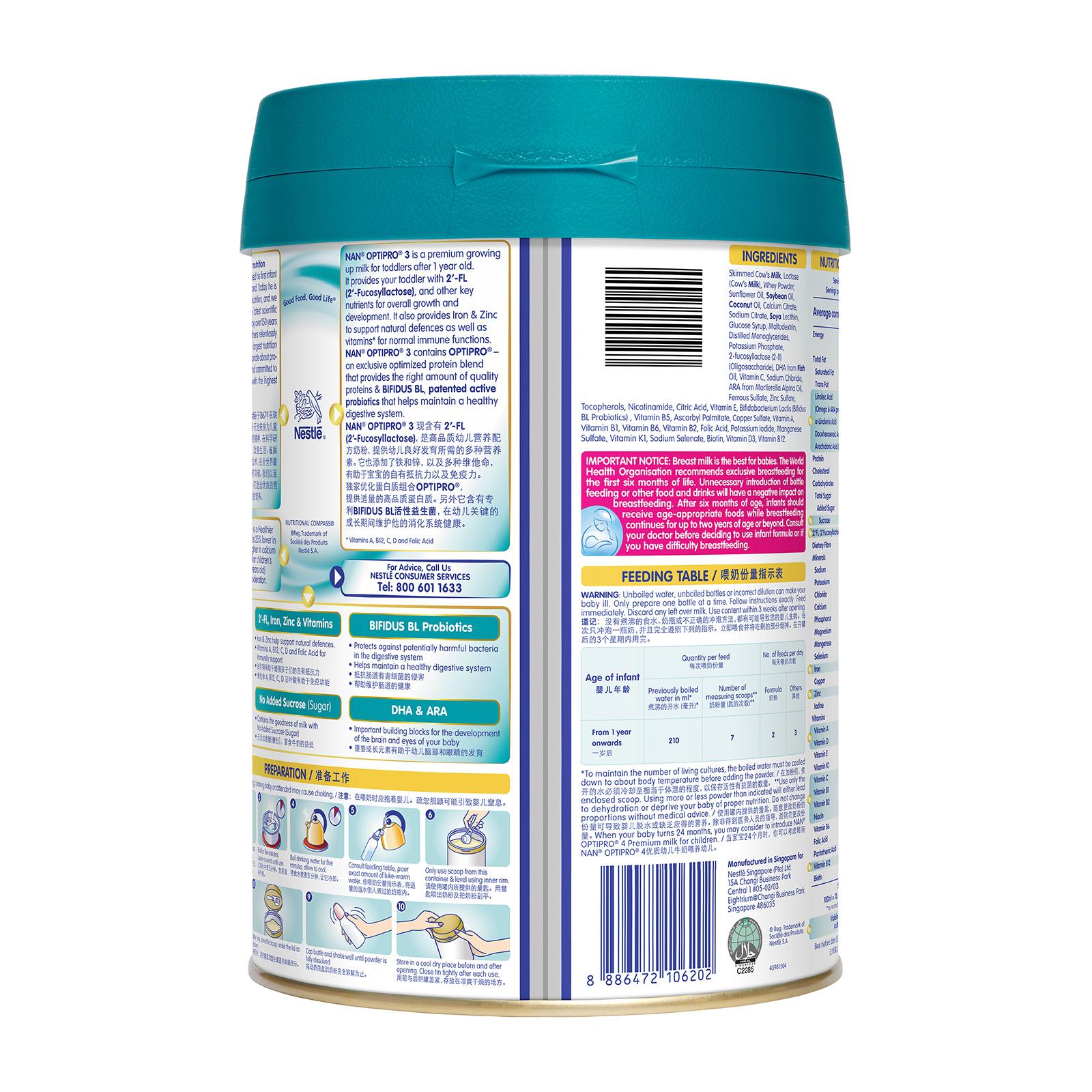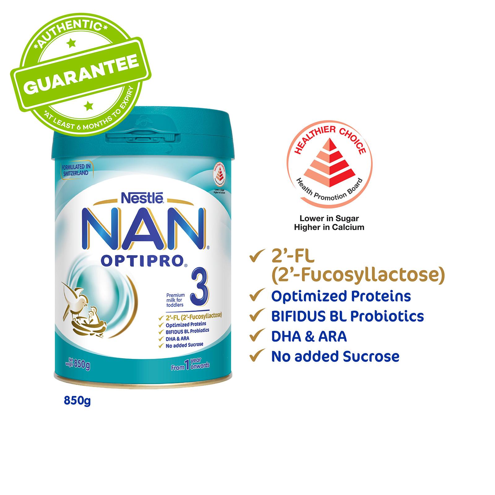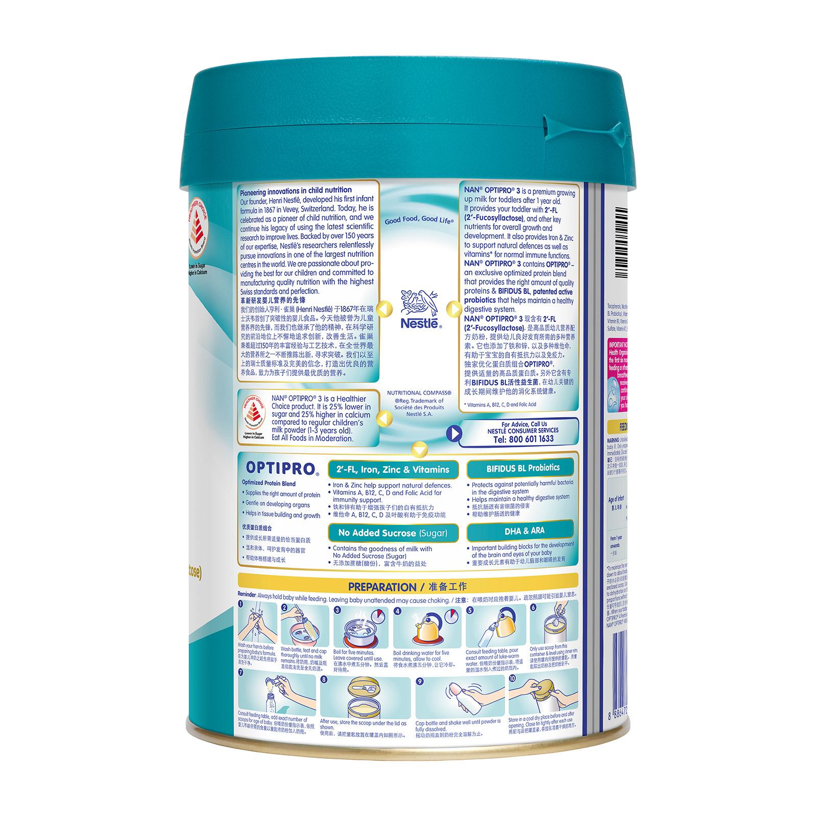 NAN® OPTIPRO® 3 with 2'-FL is a premium growing up milk for toddlers after 12 months. It now contains 2'FL (Fucosyllactose) and OPTIPRO®, an exclusive optimized protein blend that provides the right amount of quality proteins. It provides your toddler with all the nutrients essential for growth and development. Complemented with BIFIDUS BL, patented active probiotics that helps maintain a healthy digestive system during his first crucial year of life.