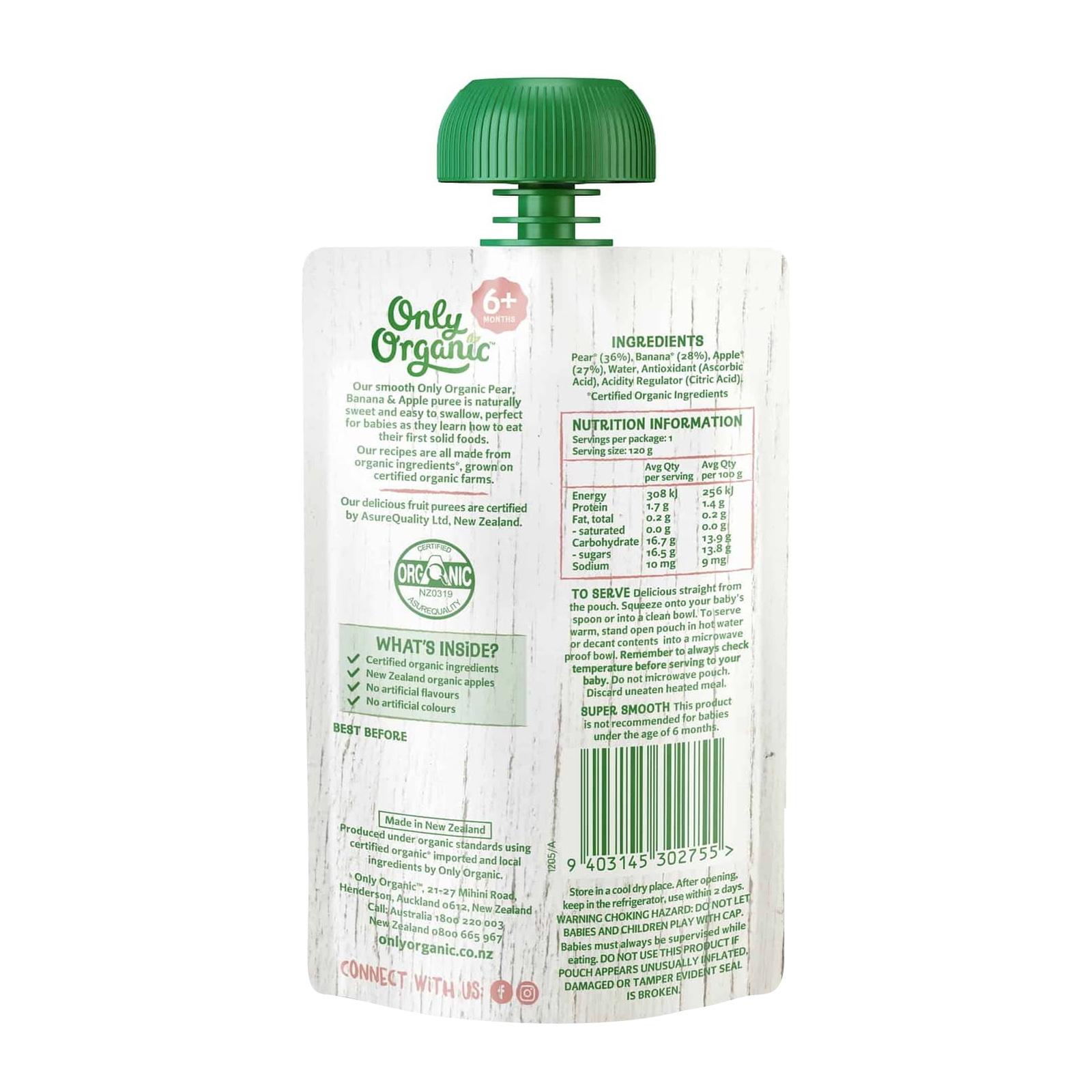Only Organic Pear Banana & Apple Pouch 120G - Second Foods For Babies - From 6 Months Jar|,|