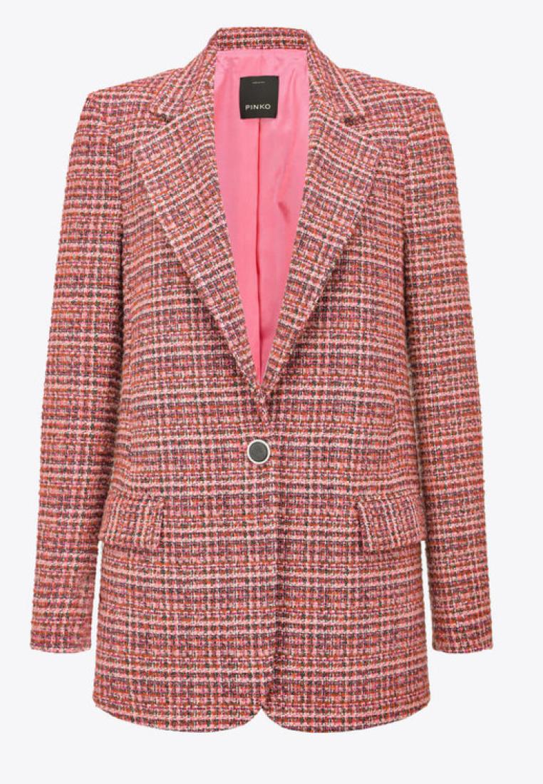 Classic blazer in patterned mouliné bouclé fabric. Lapel collar and flap-adorned side pockets. Lined. Single-breasted and fastened with one button. Made from a GRS-certified (Global Recycle Standard) sustainable material which contains recycled fibres; it aims to reduce resource consumption and increase product quality. Model is 179cm tall and wears a size 40..