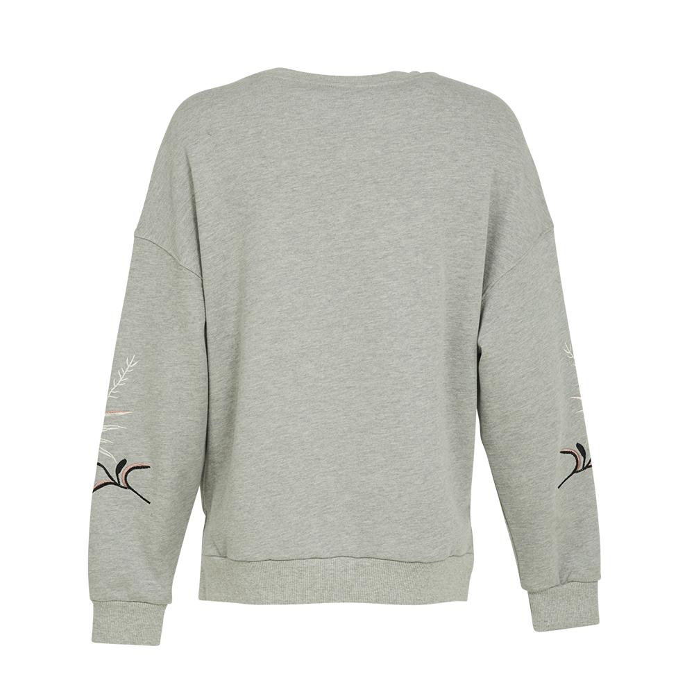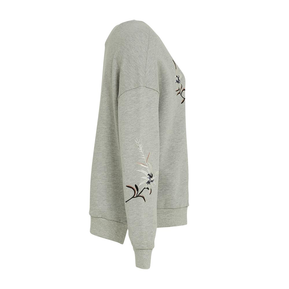 Round neck french terry fleece topDrop shoulder seamFlower embroidery in frontDesigned for a loose fit