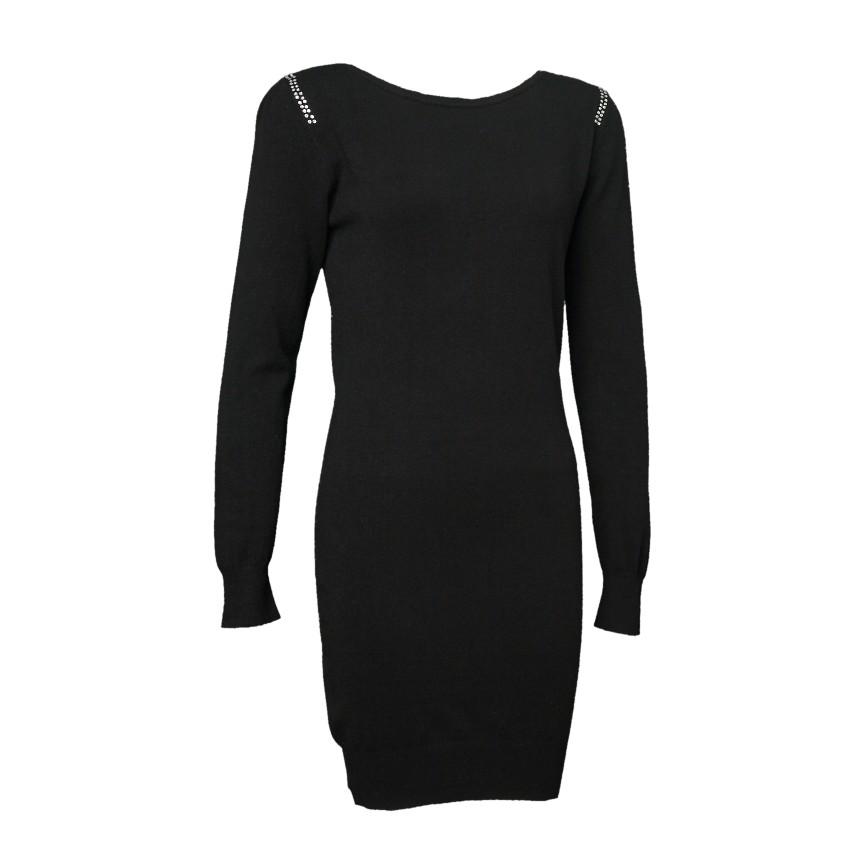 Women’s mid-length crew neck sweater dress with a feminine round neckline.