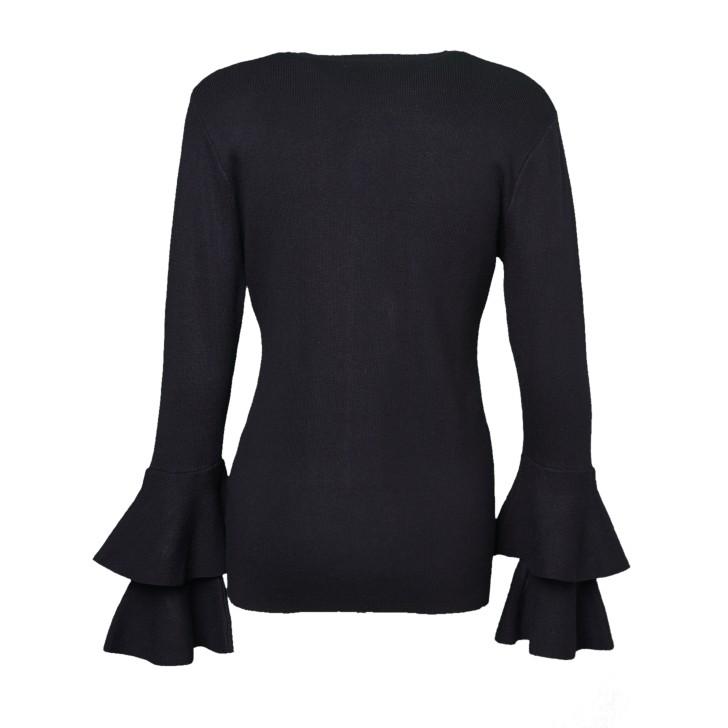 Women’s knitted sweater features flared ruffle sleeves, a straight and fitted piece with soft knitted design.